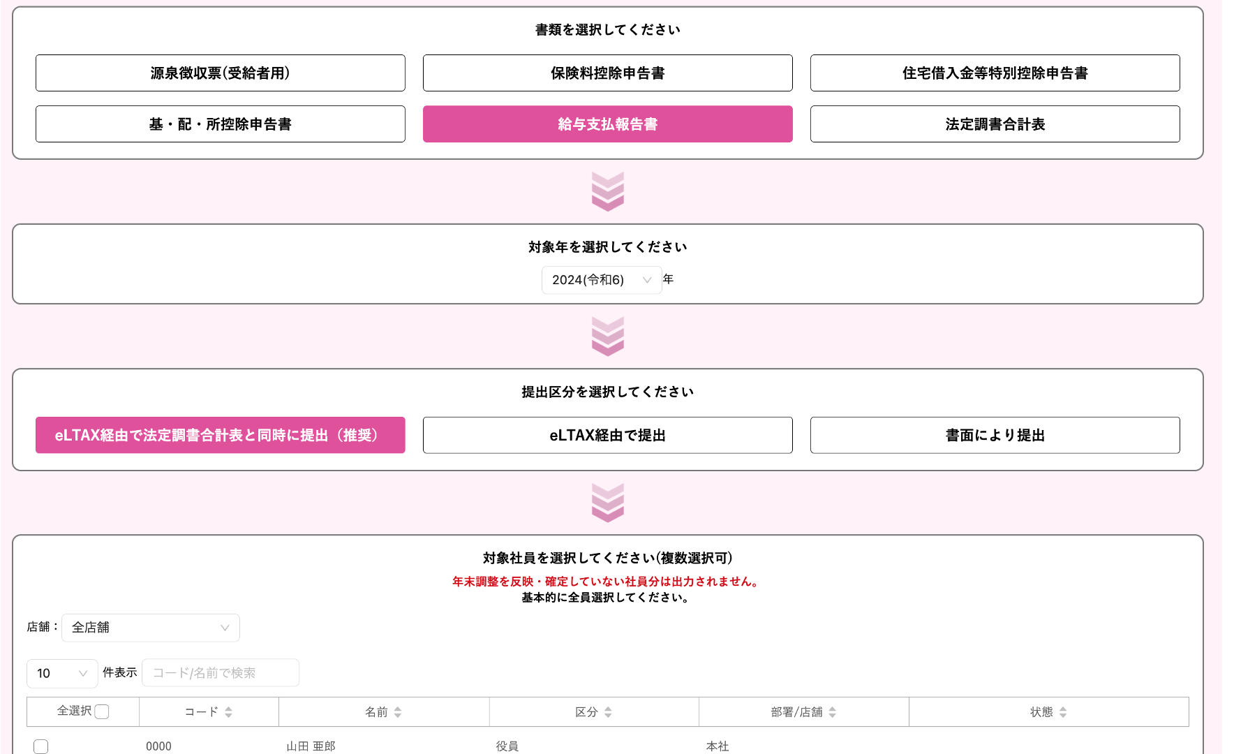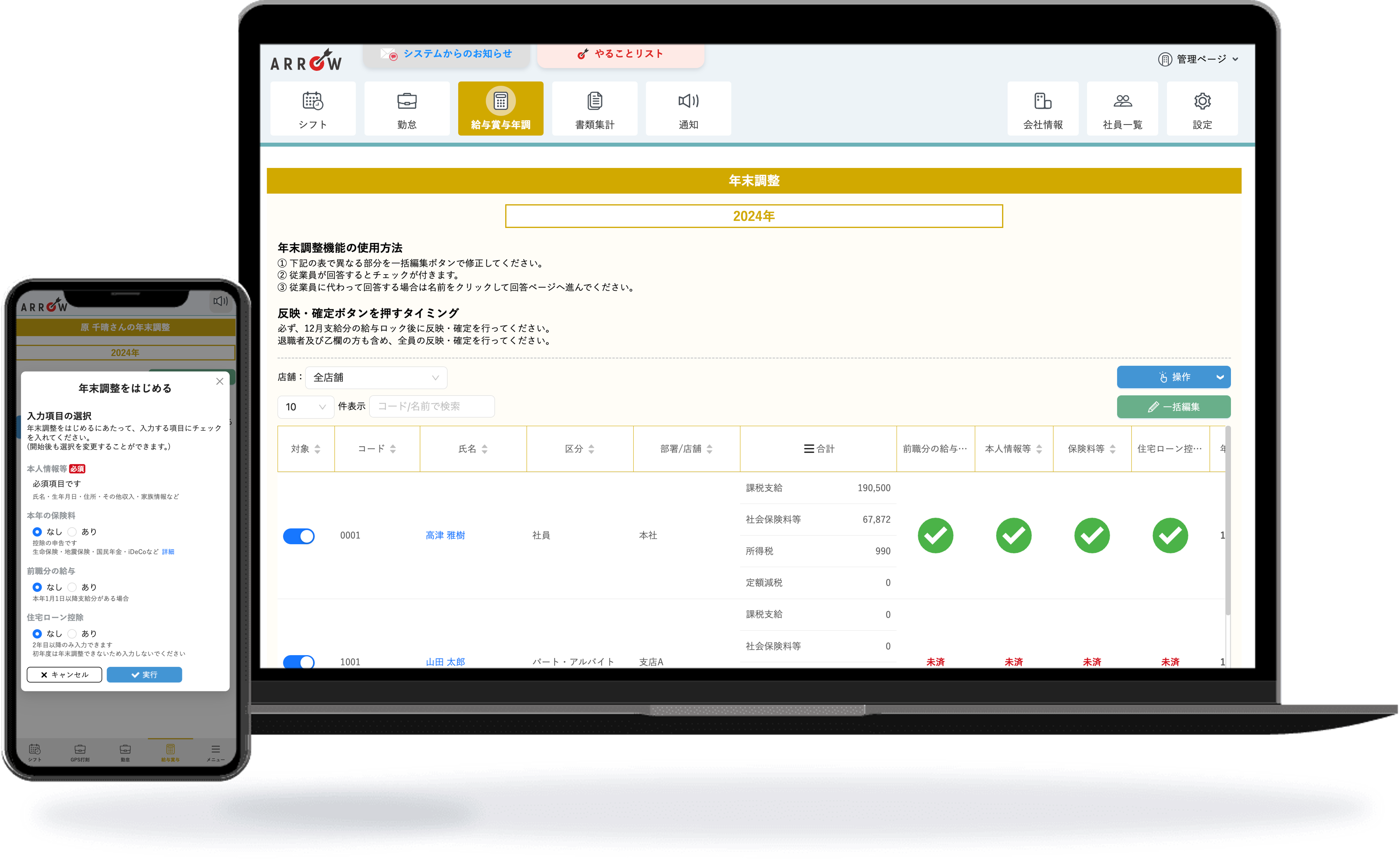 画面に出てくる質問に順を追って答えていくだけで、必要な情報はすべて集まります。年末調整に必要な書類はすべてARROWから出力することができます。